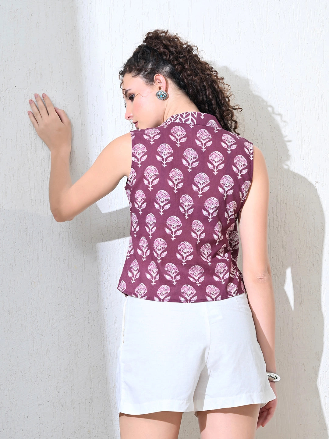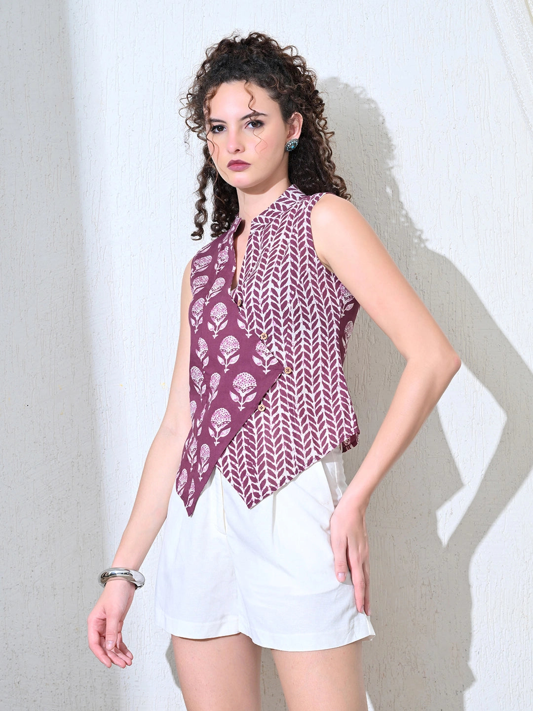 A mandarin collar vest crafted with a wrap-style cut, thoughtfully adorned with wooden buttons. This piece is brought to life through a playful medley of prints, creating a harmonious blend of structure and spontaneity. Effortlessly stylish, it’s a celebration of texture, pattern, and artisanal detailing.