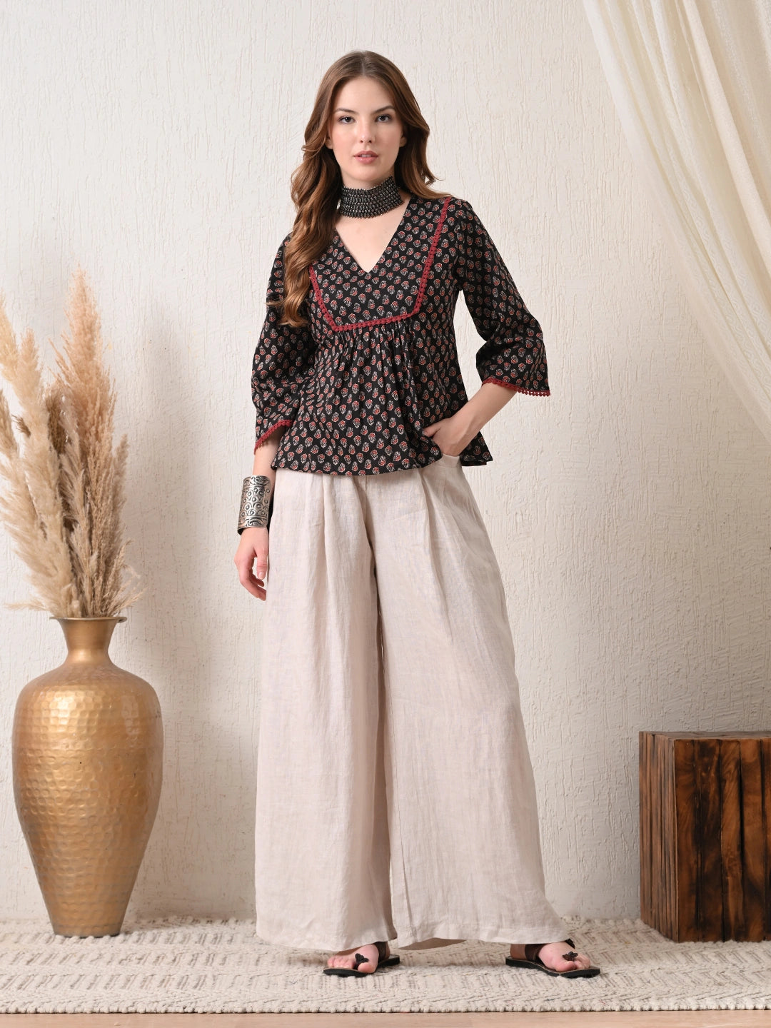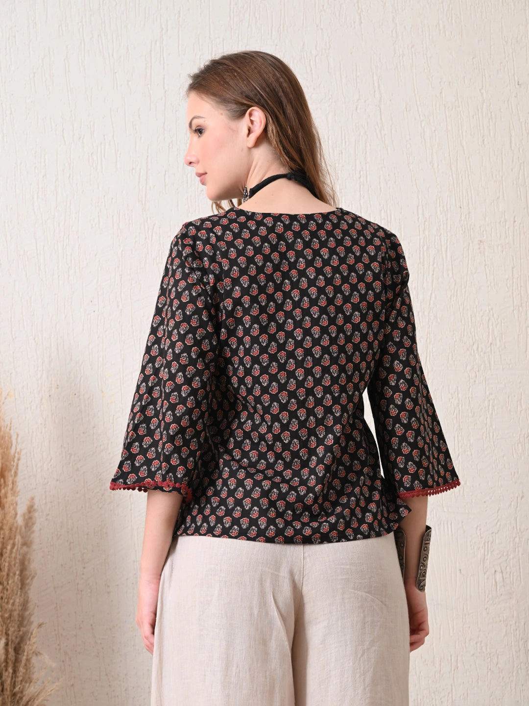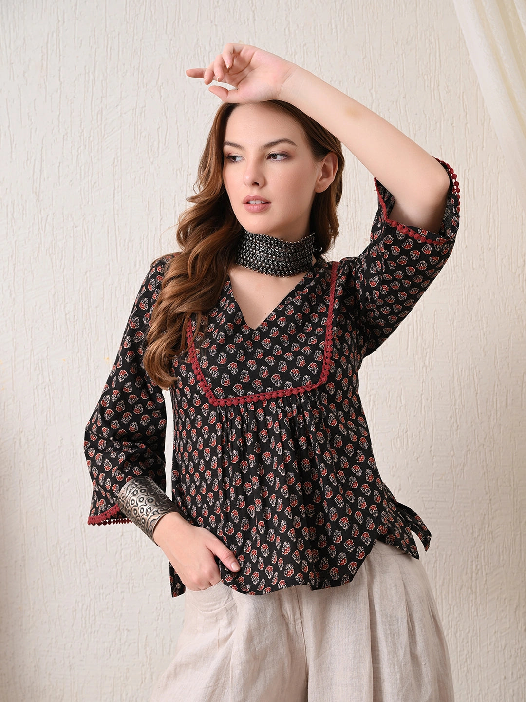 This elegant V-neck top, crafted from black handblock printed fabric, exudes timeless charm with its handcrafted appeal. The front and sleeve hemlines are adorned with delicate contrasting lace detailing, adding a touch of sophistication and finesse. Made from soft, breathable cotton, it ensures comfort while maintaining an effortlessly polished look. Pair it with beige trousers, denims, or skirts for a versatile ensemble suitable for both casual and semi-formal occasions.